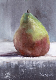 "Pear in Red and Green" 5 x 7 in oil on canvas panel